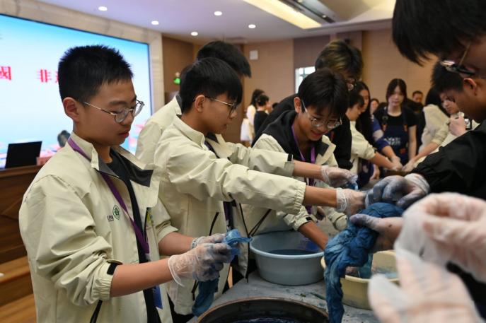 非遗植物染是我校的非遗特色课程。在欧亚梅老师的指导下,学生们以天然植物蓝染原料为笔,在织物上染制出青绿山水与江汉繁花。课程采用审美感知、艺术表现、文化理解、创意实践,从色彩哲学、纹样设计和扎染技法的艺术表现理解荆楚文化基因,创作出兼具传统韵味与现代审美的作品。当香港学生林雅雯展示自己用植物蓝染丝巾时,传统工艺与现代创意的碰撞分外精彩。