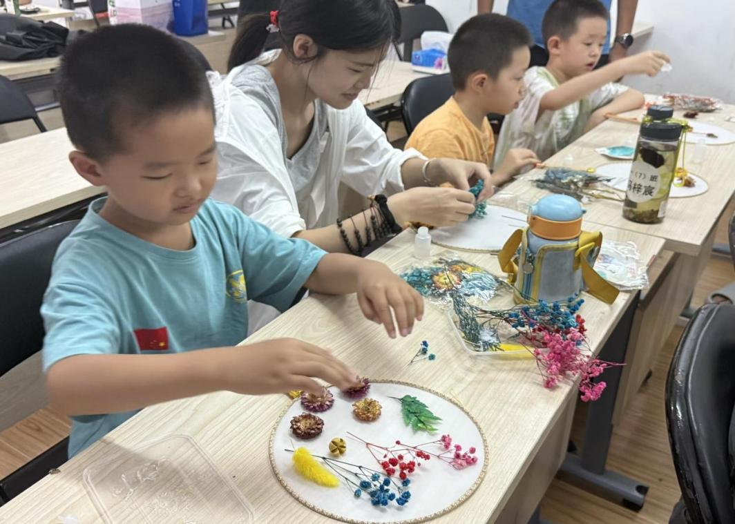“非遗团扇花语记”活动中,孩子们学习选干花、排布图、涂蜂蜡,将天然干花与古典团扇结合,创作出会呼吸的立体标本画。