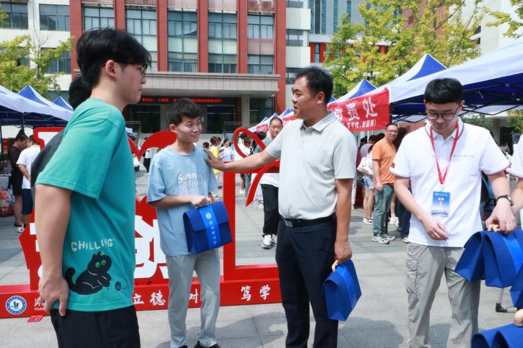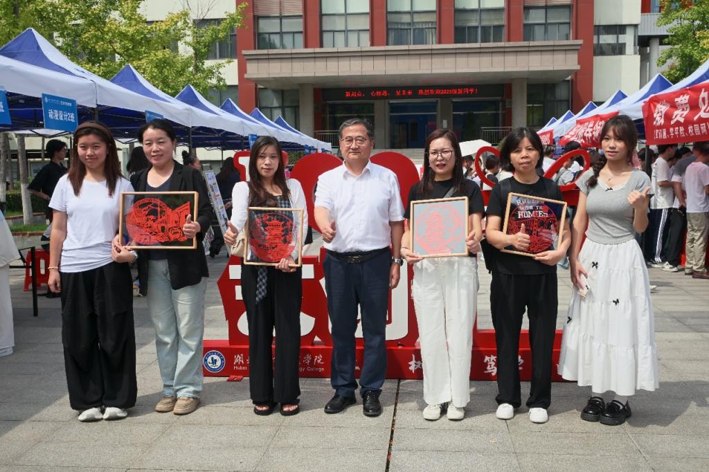 迎新现场,校党委书记钟毓宁、副校长周得力将师生共创的武汉地标剪纸,作为暖心礼物赠予外地新生家长,充分展现了武汉城市文化及学院的非遗育人特色,更把学校的关怀与温暖送到新生身边。