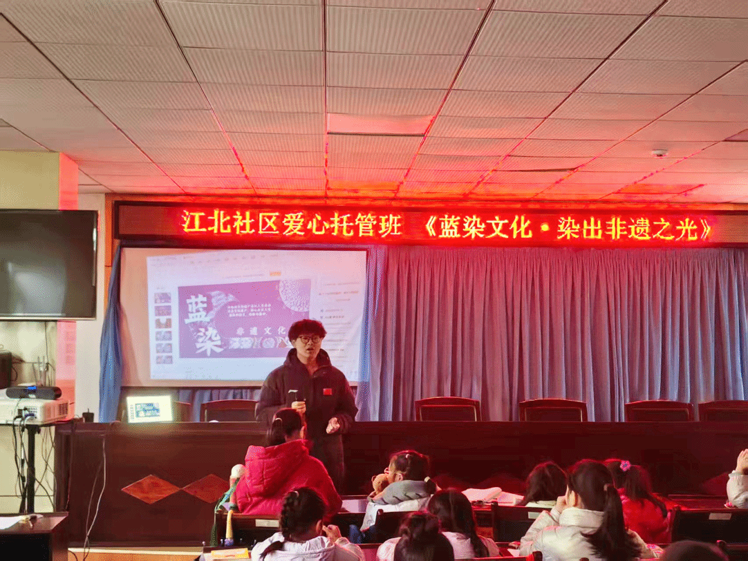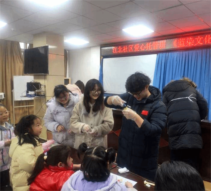 2023级广告艺术设计专业学生叶子涵主动报名参加“寒假爱心托管班”社会实践项目。他深入湖北省黄冈市赤壁街道江北社区党群服务中心,开展了为期5天的志愿服务活动,用艺术之光点亮童心,其生动实践获《湖北日报》报道推介。在社会实践中,叶子涵立足专业所长,将非遗文化传承与社区美育教育深度融合。针对基层青少年对非遗文化认知尚浅的现状,他精心打磨课程设计,将“非遗蓝染”这一传统技艺搬进社区课堂,通过“沉浸式体验+互动式教学”,让原本枯燥的理论知识变得鲜活生动,激发了当地青少年对传统文化的浓厚兴趣。